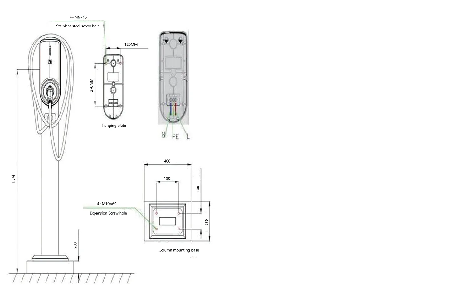 1) चार्जिंग पाईलसाठी काँक्रिट फाउंडेशनची ताकद C25 असावी. भूमिगत भाग 400 मिमी आहे, आणि जमिनीच्या वरचा भाग 200 मिमी आहे. काँक्रीटचे परिमाण 400*250mm आहेत. फाउंडेशनच्या मध्यभागी एक पुरलेला आउटलेट पाईप असावा आणि फाउंडेशनवर 4 M10*60 विस्तार बोल्ट निश्चित केले पाहिजेत.
