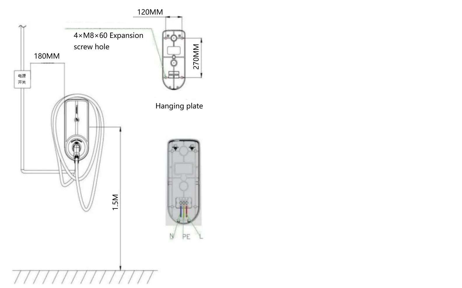 1) जमिनीपासून चार्जिंग पायलच्या उंचीचा संदर्भ डेटा (1.3-1.5 मीटर)2) मागील प्लेटवरील माउंटिंग होलच्या स्थितीनुसार भिंतीवरील मागील प्लेटवर माउंटिंग होलची स्थिती चिन्हांकित करा.